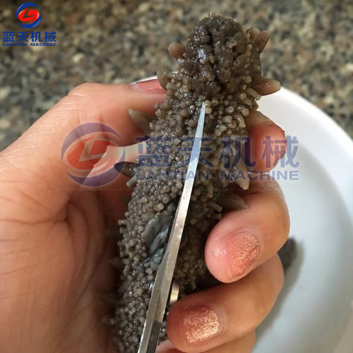 第一步:海參剪口擠腸:海參用清水清洗一下,從其腹部用剪子剪開兩三厘米的口,將內(nèi)臟及腸子取出,不去掉腸子,整個(gè)海參都會化掉。