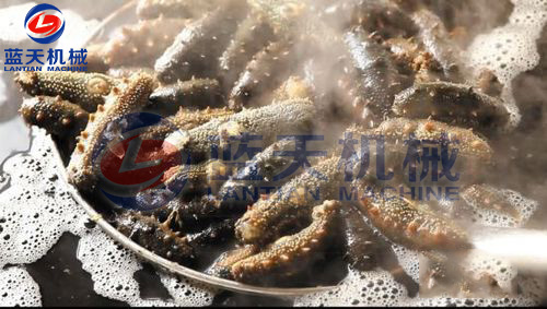 第三步:蒸煮海參:當(dāng)水溫在90度時(shí),將清洗好的海參放入鍋里蒸煮,用工具來回?cái)嚢瑁乐顾疁夭痪?,這時(shí)可見到海參迅速縮小,海參刺明顯突出。約半小時(shí)后,撈出海參,視情況拌入粗鹽。