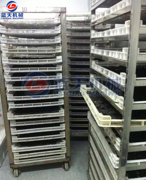 第四步:海參烘干:將煮好的海參擺放在物料盤上,將擺好海參的物料盤放置入空氣能熱泵海參烘干機(jī)內(nèi),通過智能控制系統(tǒng)設(shè)置烘干溫度、濕度和時(shí)間參數(shù),開始干燥。