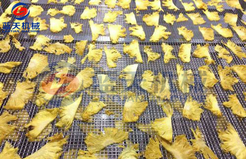第三步:切好的菠蘿片進(jìn)入熱泵烘干系統(tǒng)里烘干的過程,可以分成5段完成,第一段,烘干,不除濕,時間1.5個小時,內(nèi)外溫度一致,溫度50度,第二階段,溫度53度,開始連續(xù)除濕,除濕到40%,第三階段溫度58度,連續(xù)除濕,濕度26%,第四階段溫度55度,濕度20%,連續(xù)除濕,第五段溫度48度,濕度18%,連續(xù)除濕1小時,烘干完成。