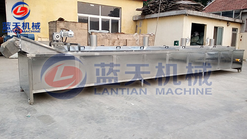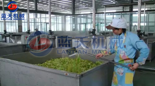 將洗干凈的原料根據(jù)產(chǎn)品要求分別切成片、絲、條等形狀。預(yù)煮時,因原料不同而異,易煮透的放沸水中焯熟,不易煮透的放沸水(水溫一般在150℃以上)中略煮片刻,一般燙漂時間為2~4分鐘。葉菜類最好不燙漂處理。
