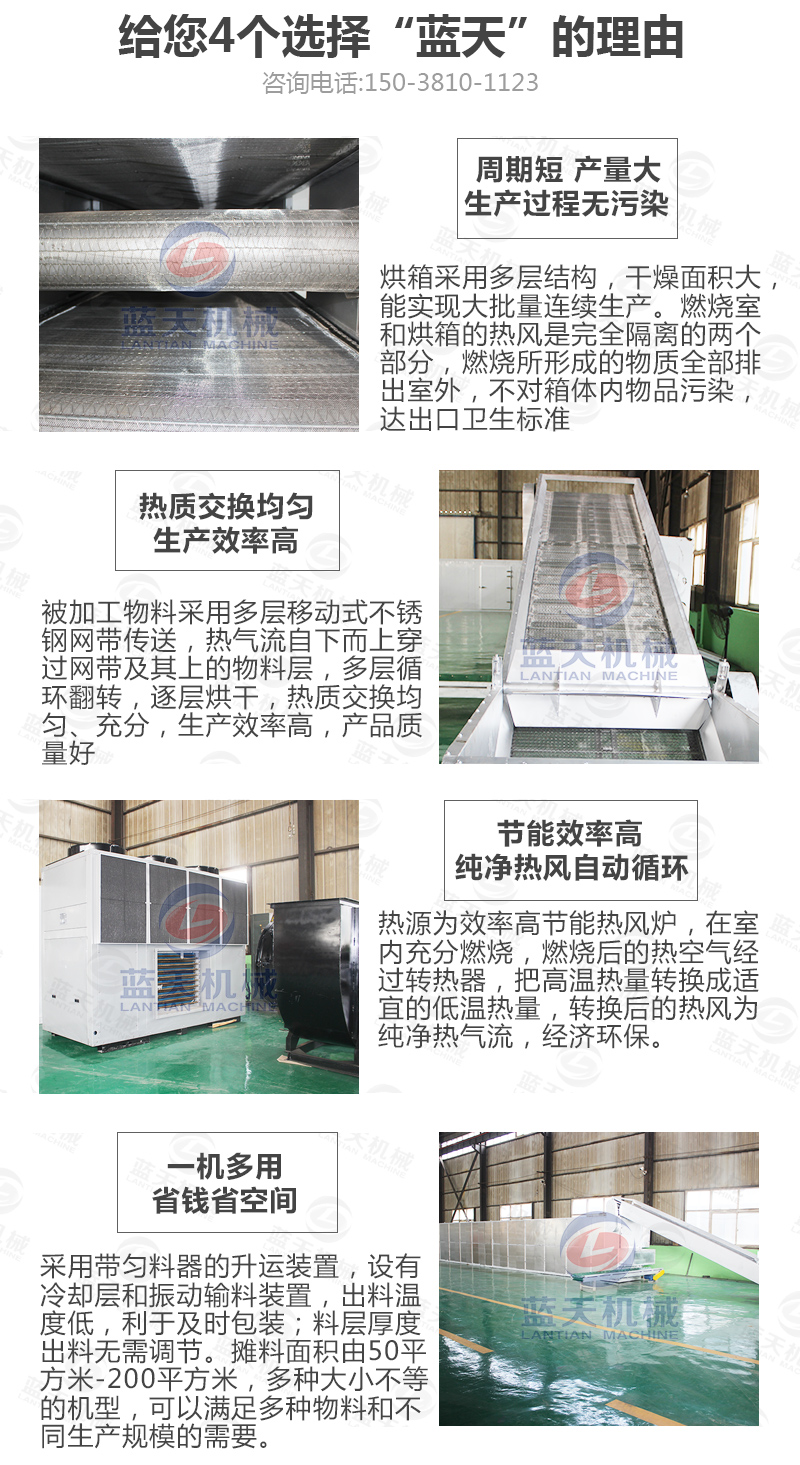 辣椒網(wǎng)帶烘干機(jī)是一款由多層不銹鋼網(wǎng)帶來完成物料的上料、輸送、翻轉(zhuǎn)、出料等工作連續(xù)式烘干設(shè)備。網(wǎng)帶式辣椒烘干機(jī)中的網(wǎng)帶采用304不銹鋼制作,不會對要烘干的辣椒造成污染;辣椒網(wǎng)帶烘干機(jī)內(nèi)溫度可調(diào),自然排濕;可以模仿自然晾曬,3~5人即可完成整條干燥線操作;干燥周期短,品質(zhì)高;可廣泛應(yīng)用于各種中藥類、蔬菜類、青草飼料類、谷物類物料的干燥烘干。