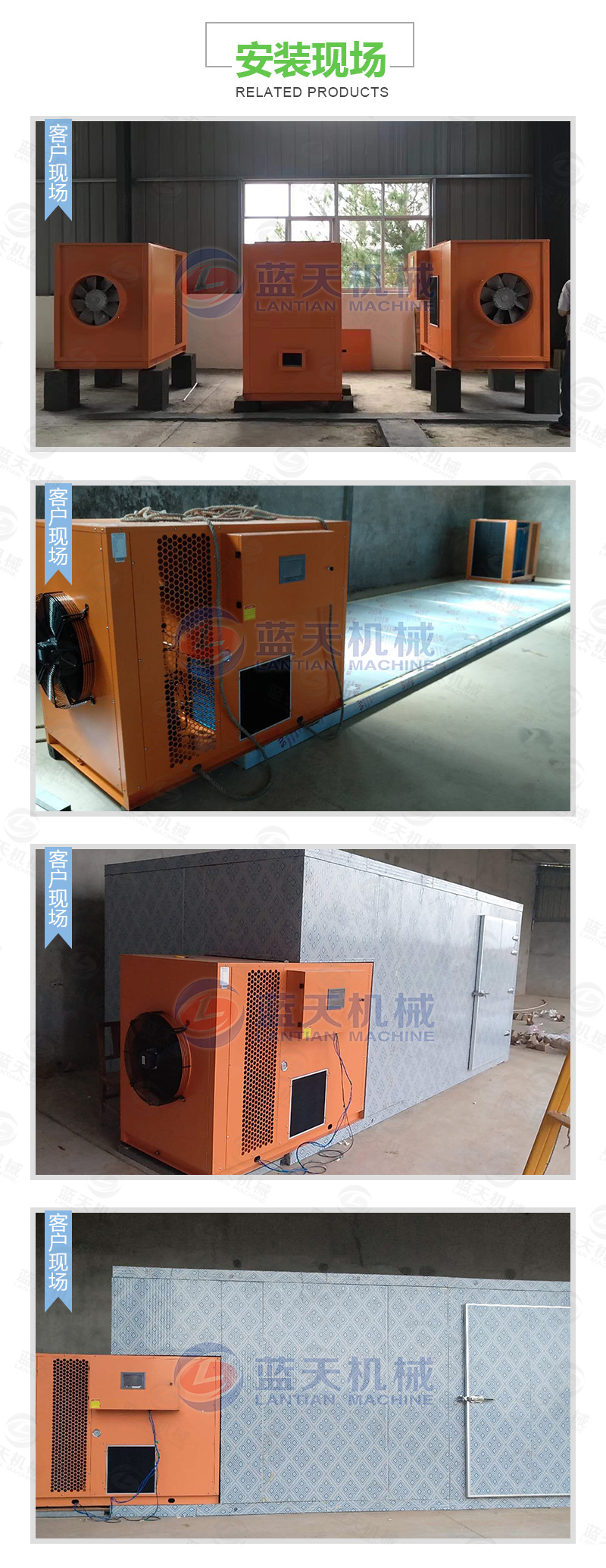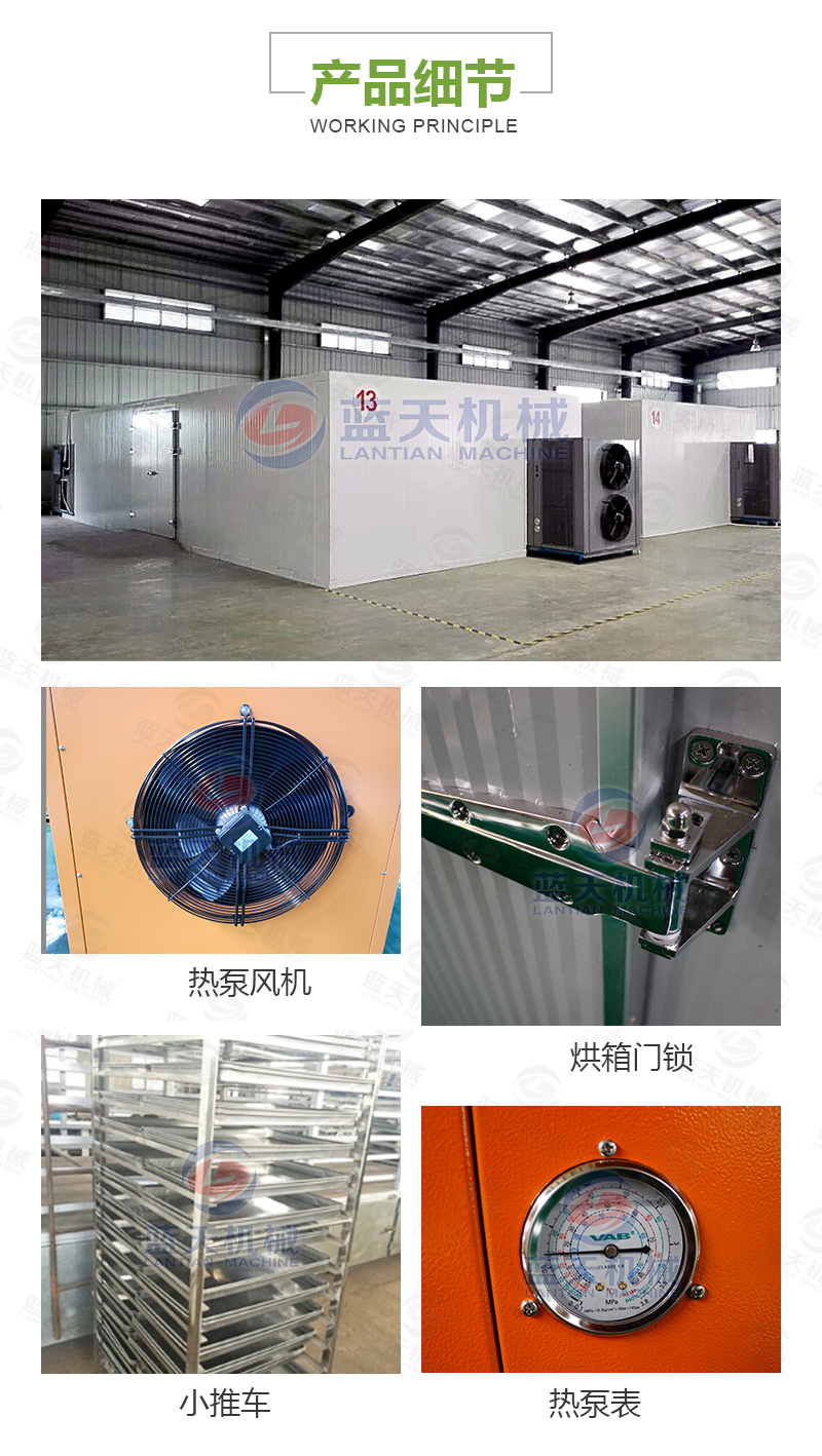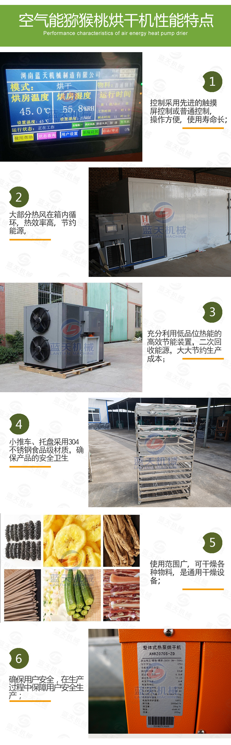 1.熱源空氣能熱泵機(jī)組。2.烘干機(jī)保溫房體。3.烘干機(jī)內(nèi)部熱風(fēng)循環(huán)裝置。4.自動排濕裝置。5.溫濕度智能控制裝置。6.裝放獼猴桃干的物料小推車和物料托盤。