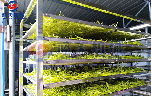 先把黃花菜均勻的攤放在推車托盤上,推車托盤最要用不銹鋼制作的,有利于加快干燥的時間。每層大約攤放7公分厚。層與層之間要預留8公分的距離,確保每層的通風效果。一部推車最好不要超過15層。裝好后放在烘干房內(nèi)。