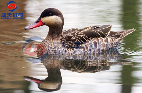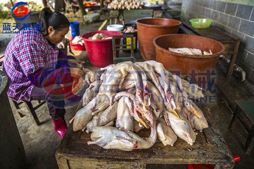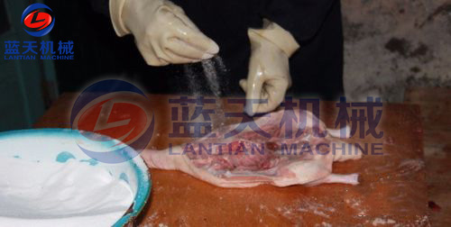 鴨只屠殺之前應(yīng)予12~24小時(shí)絕食,并給以充分清水,使之安靜休息。如此可使屠殺放血良好,并可減少未完全消化的飼料污染屠體的機(jī)會(huì)。經(jīng)屠殺后,將屠體外表洗凈,祛除余毛,并應(yīng)即速冷卻。鴨之屠體選用無骨折及瘀血斑點(diǎn)者,并將鴨只在肘關(guān)節(jié)及跗關(guān)節(jié)下端分別將兩翅及兩腳去掉。以左手抓住鴨之下額骨,右手持刀從口腔割掉帶舌的下額部,此處理俗稱割外五件。