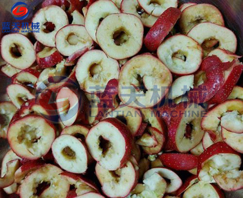 第二步:洗凈山楂果后,要盡快擦干其外表的水分,再進行切片處理,需要去除或保留果核?,F(xiàn)在也有專門的切片機器,效率很高,且切片的厚薄均勻,一般在3mm左右。