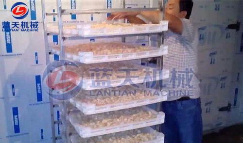 將蒜片均勻鋪放在不銹鋼物料托盤上,溫度控制在55-60°C左右,烘6-8小時。烘干過程中,注意蒜片烘干房的干燥,熱風(fēng)量和排濕氣量要穩(wěn)定,到后期干燥時,由于大蒜纖維細(xì)密且蒜片中液體黏稠,使蒜片水分遷移蒸發(fā)變得緩慢,直至蒜片干燥至含水率約為4-6%以內(nèi)即完成干燥。烘干期間須嚴(yán)格控制好時間和溫度,以免干燥時間過長,溫度過高,使蒜片干色澤、外形及營養(yǎng)價值受損,影響蒜片的品質(zhì)。