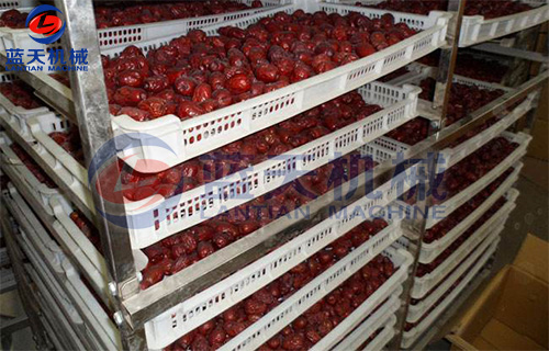 3、烘干工藝:先在熱水中瀝干棗表面的糖漿,然后裝入物料盤,將物料盤物料車,推入烘干房,使含水量降至15%左右,烘干溫度開始為50℃,過6-7小時(shí)升至70-80℃等棗皮發(fā)皺即可,用手摸感到外硬內(nèi)軟時(shí)取出包裝。