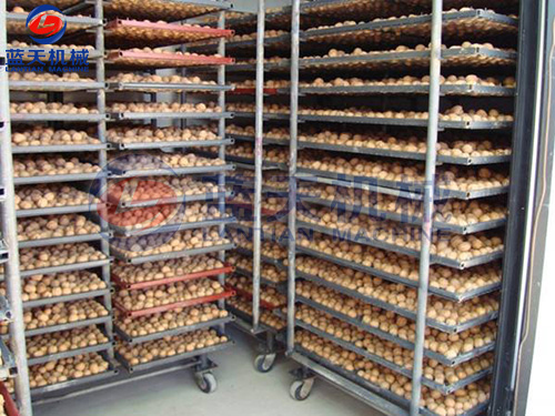 脫青皮后8小時(shí)內(nèi)入倉上架排濕烘烤,排濕溫度35-40℃,烘烤時(shí)間12-15小時(shí),果殼表面水分散失,顏色由黑褐轉(zhuǎn)為褐色時(shí)排濕結(jié)束。