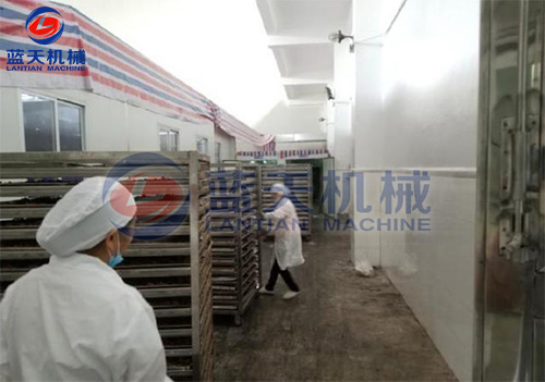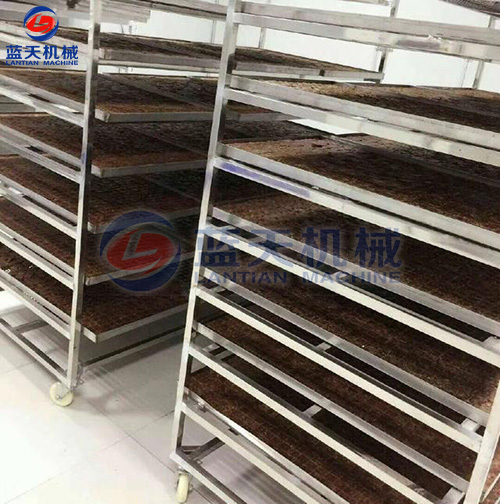 紅糖烘干工藝:將紅糖磚切成方塊狀,置入托盤(pán)中,在物料架中分層放好,注意層與層之間的距離,將物料車推入烘干房,開(kāi)始啟動(dòng)溫濕控制系統(tǒng),在紅糖烘干機(jī)的使用過(guò)程中,第一個(gè)小時(shí)可以只升溫不排濕,因?yàn)樵诠ぷ鞯牡谝浑A段,烘干房里面的濕度很低。第二階段設(shè)定為烘干加排濕的工作程序模式。紅糖烘干機(jī)帶有余熱回收功能。在排濕過(guò)程中的熱量會(huì)重新參與到烘干房的熱循環(huán)。排濕過(guò)程當(dāng)中不會(huì)造成熱量浪費(fèi),從而降低了運(yùn)行成本。