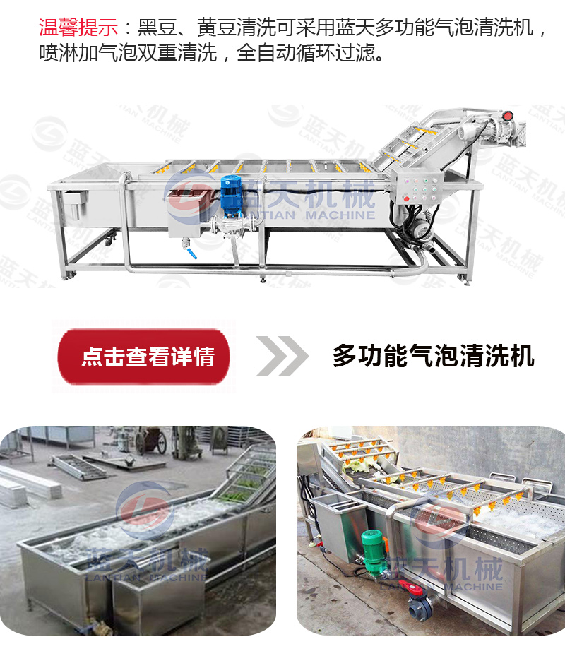 1、原料選擇及清洗:選擇成熟、顆粒飽滿均勻、皮薄肉多、無(wú)蟲蝕、無(wú)霉?fàn)€變質(zhì)、并且有新鮮度的黃豆或黑大豆為宜。用清水多次洗去大豆中混有的砂粒雜質(zhì)等。有條件的可以使用自動(dòng)化的果蔬清洗機(jī)來(lái)大批量清洗黑豆。